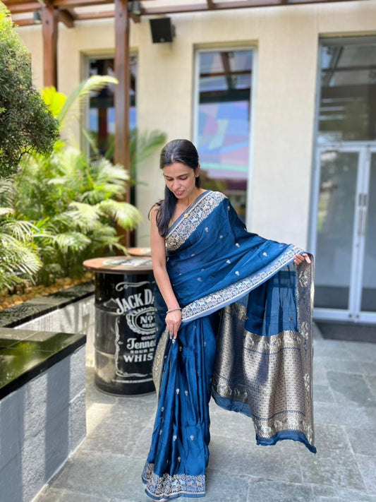 Royal Blue Crushed Georgette - Banarasi Saree