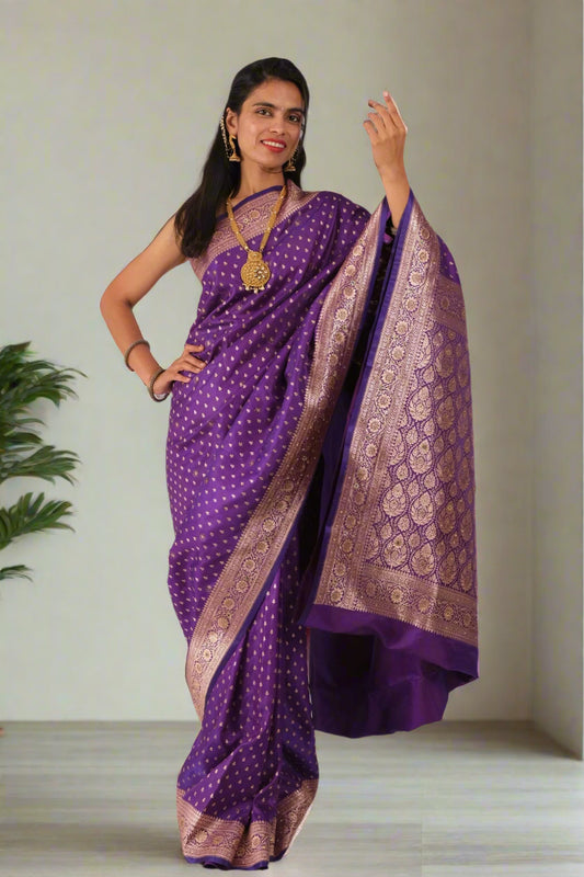 Fluid drape, subtle luxe—Silken Saga’s Russian Crepe Banarasi sarees for graceful elegance.