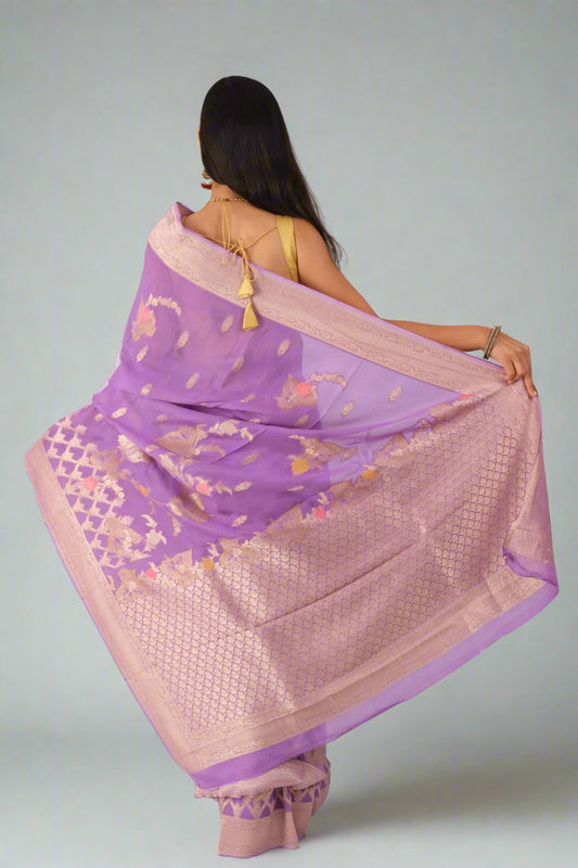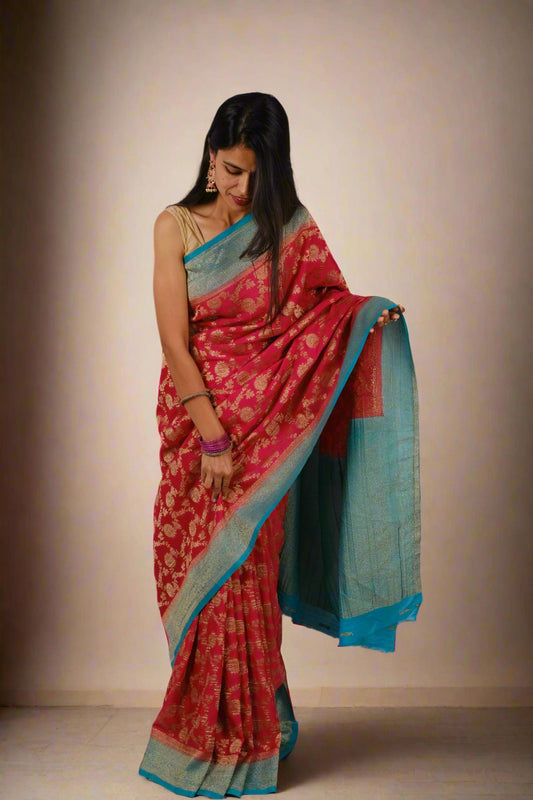 Textured elegance—Banarasi weaving meets fluid georgette.