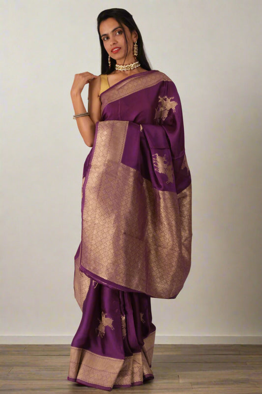 Purple Deer Print Mashru Silk - Banarasi Saree