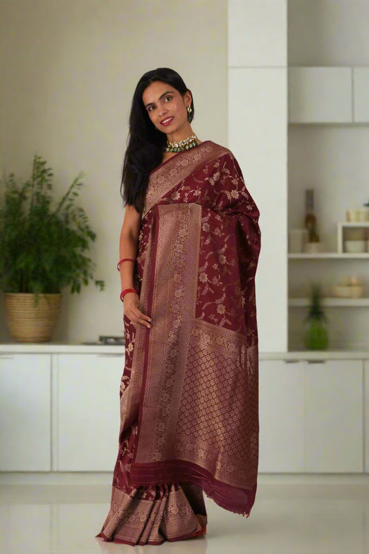 Soft sheen, easier wear—Silken Saga’s Mashru Silk Banarasi sarees blend elegance with comfort.